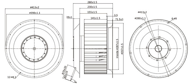 ?、偌夹g(shù)參數(shù):風(fēng)輪直徑355mm,由4極和6極額定電壓為230/400V,頻率50Hz三相異步運(yùn)轉(zhuǎn)電機(jī)組成。最大風(fēng)量分別為5700m3/h和3900m3/h。
