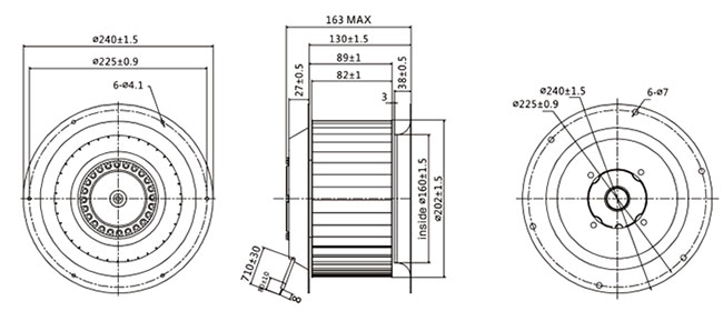 單進(jìn)風(fēng)前傾式離心風(fēng)機(jī)根據(jù)風(fēng)機(jī)外形可分為蝸殼前傾式離心風(fēng)機(jī)和常規(guī)前傾式離心風(fēng)機(jī)兩種。蝸殼前傾式離心風(fēng)機(jī)共有120mm,133mm,140mm,150mm,160mm,180mm六種風(fēng)機(jī)。常規(guī)前傾式有200mm,225mm,250mm,280mm,315mm,355mm,400mm,450mm八種風(fēng)機(jī)。